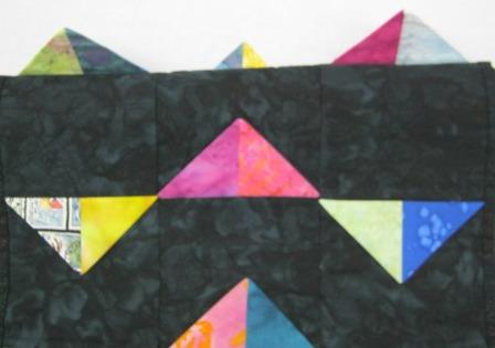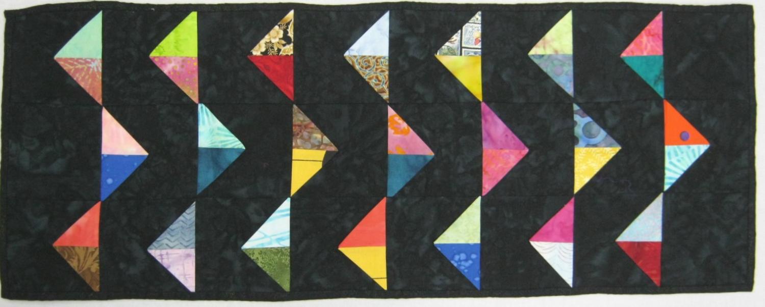 Rows of two-color triangles sewn into the seams with the tips left loose, form this 12-1/2" x 32" table runner. Ready to use.
