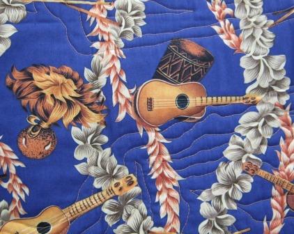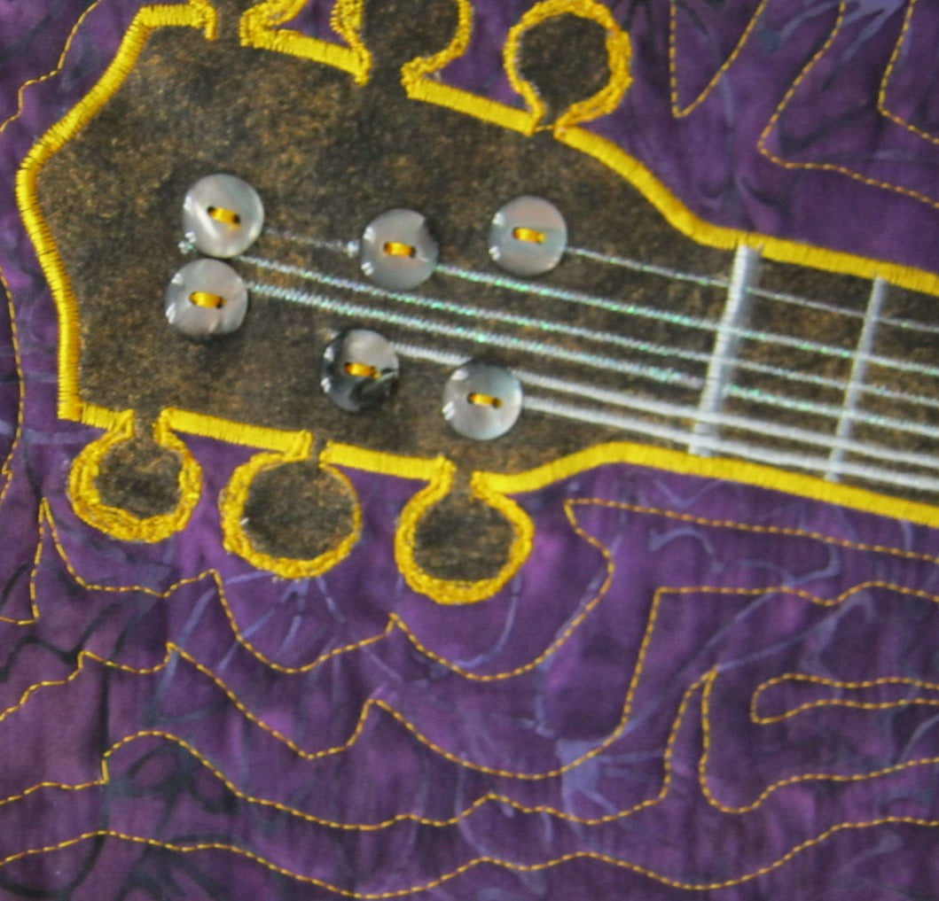 This 11-1/2" x 26-1/2" wall hanging is of a satin-stitch appliqued patchwork ukulele on a purple background. Strings are sewn in with a decorative stitch and shiny buttons used on head of instrument. Piece is free motion echo quilted. Extra pictures show close-up details of head and the fabric used on the back.