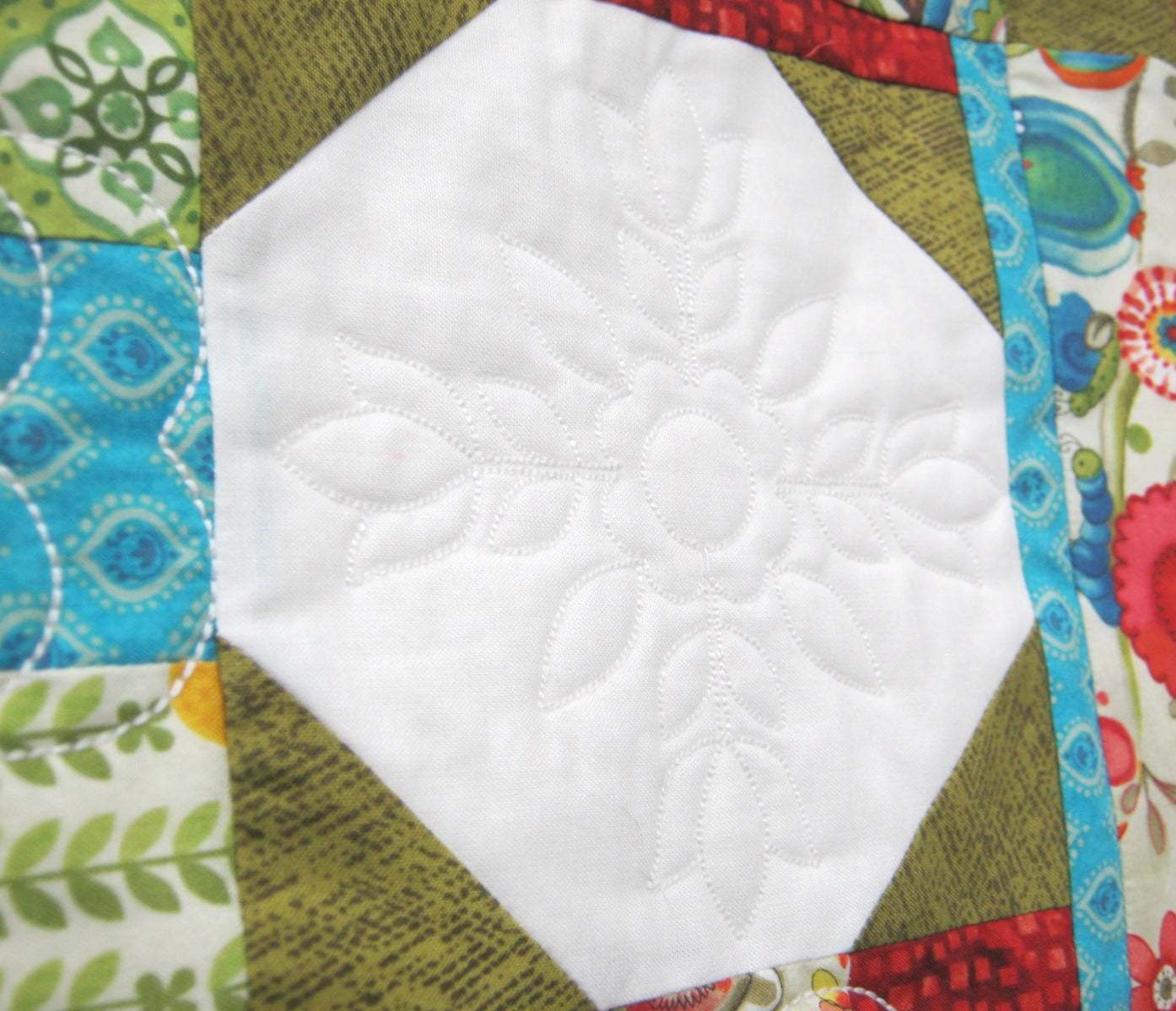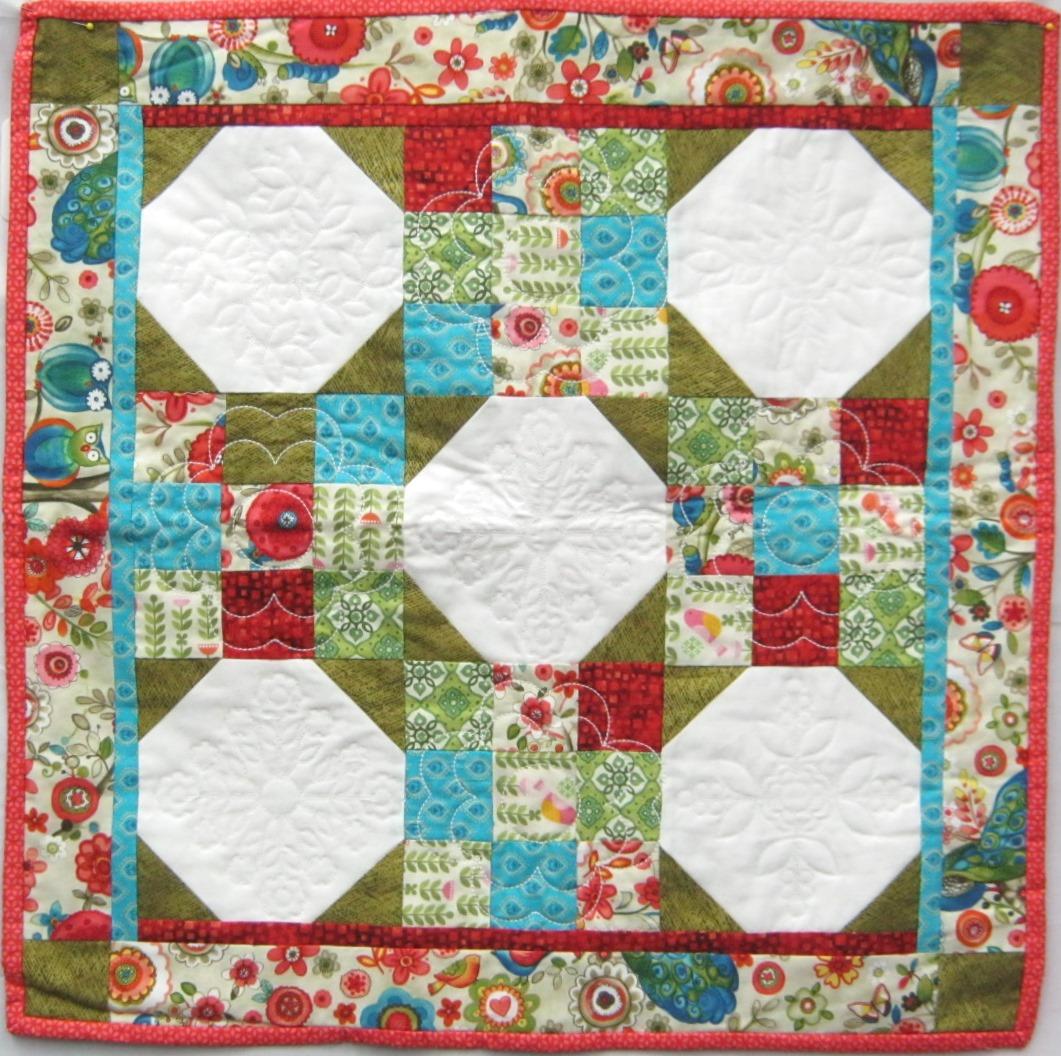 Quilted snowball and 9-patch squares make up this 23" x 24" wall hanging. The motifs in the squares were quilted with an embroidery design on an embroidery machine.