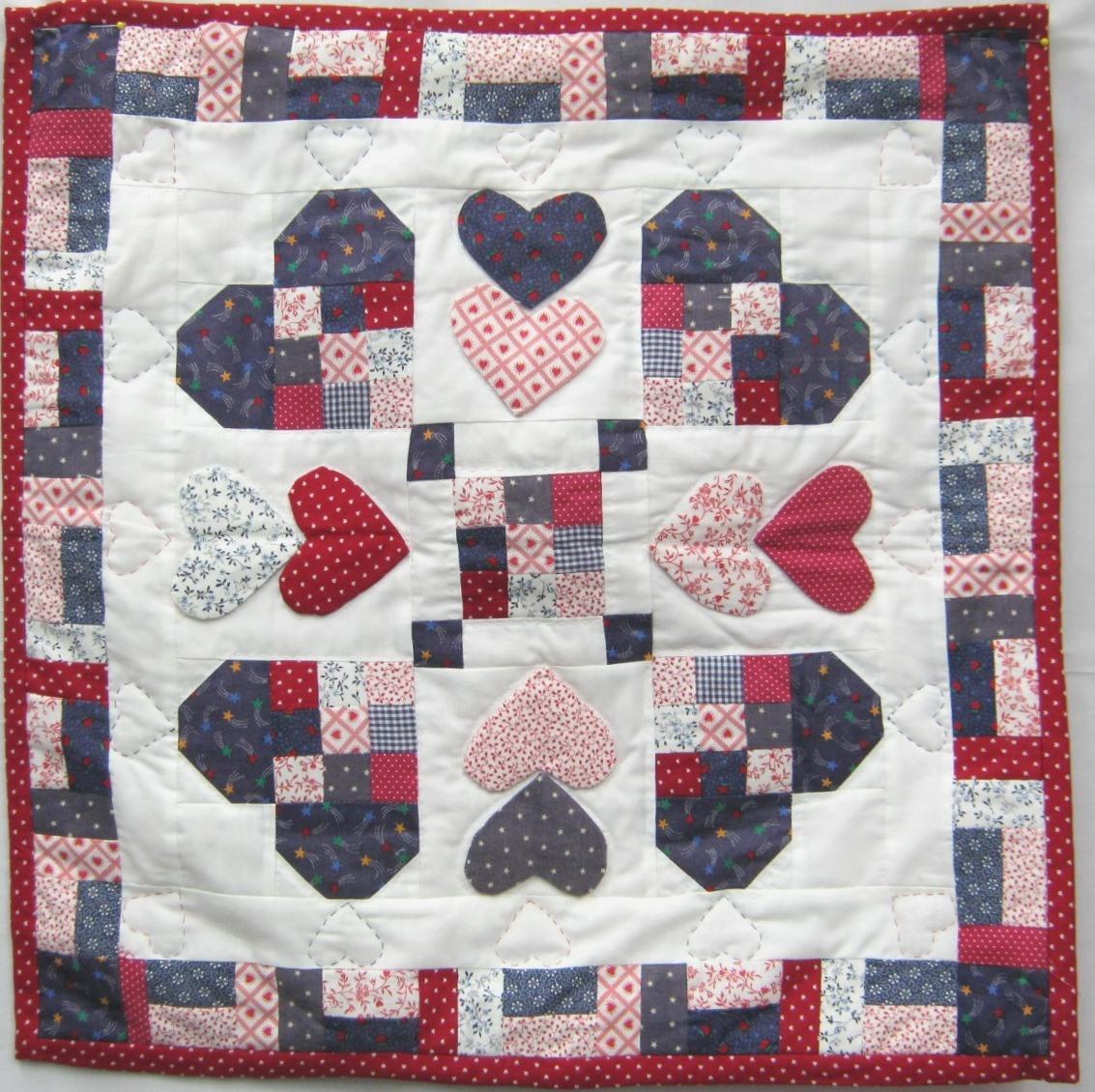 This 22-1/2" square wall hanging is of patchwork hearts and appliqued "puffed" hearts, all done in red, white & blue fabrics. Machine pieced and hand quilted. 2nd picture shows detail of hearts quilted into inner border.