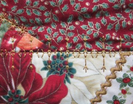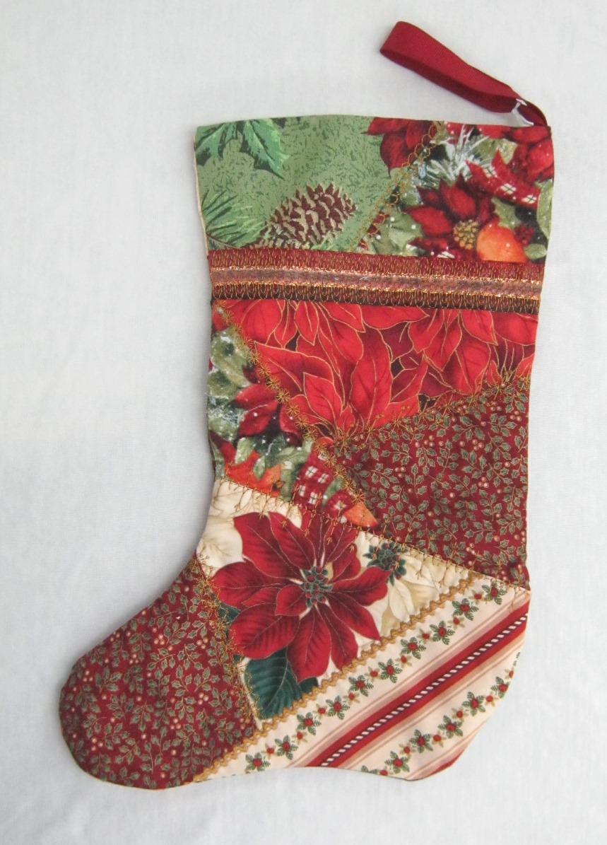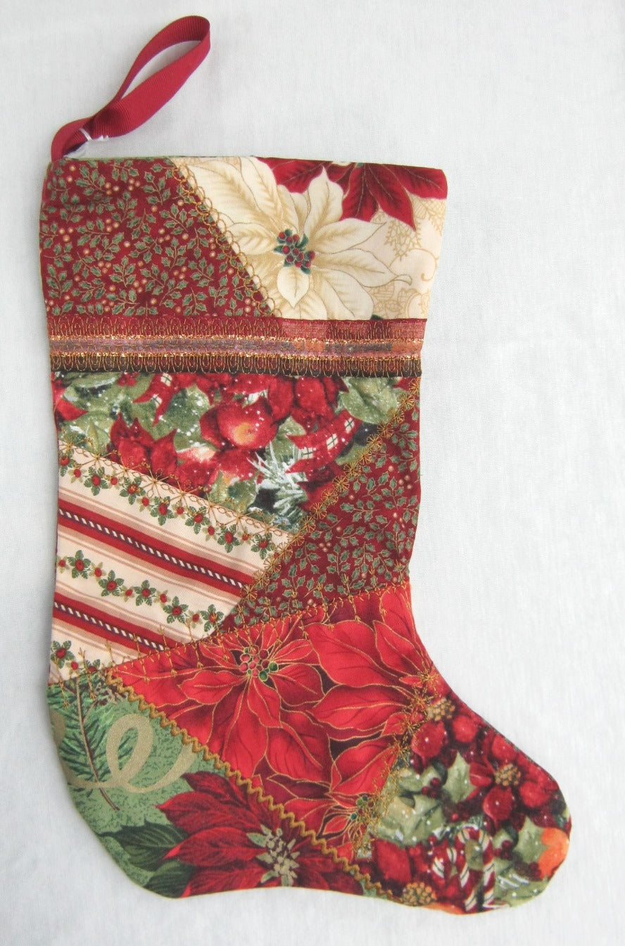 This 13" tall stocking is pieced in the crazy quilt style. Decorative stitches are along each seam. Stocking is lined with a red ribbon handle. 100% cotton.