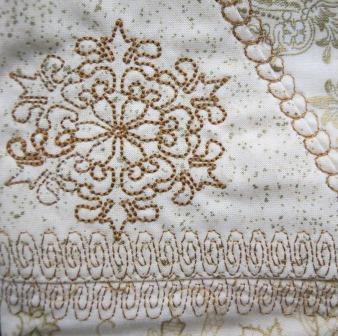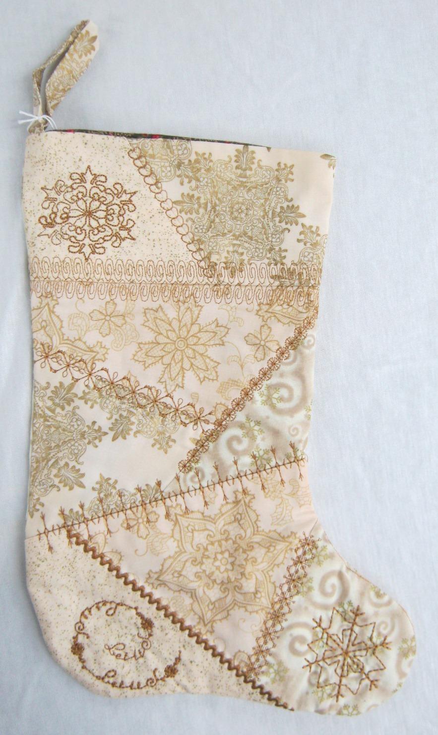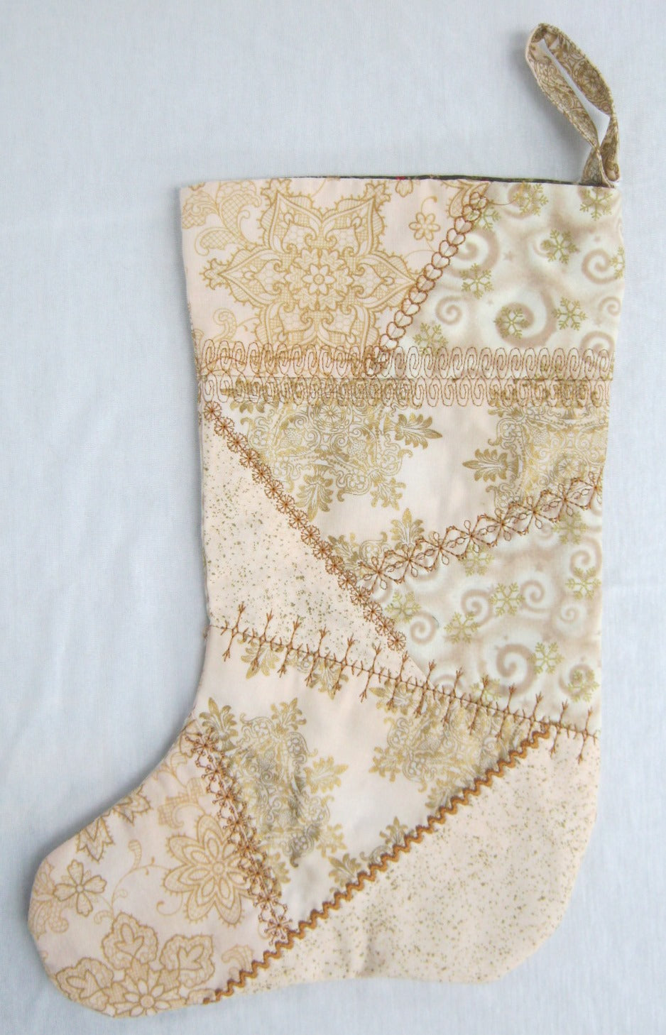 This 13" tall stocking is pieced in the crazy quilt style. Decorative stitches are along each seam, as well as simple embroidered snowflakes in the cuff and toe area. Stocking is lined and has a handle. 100% cotton.