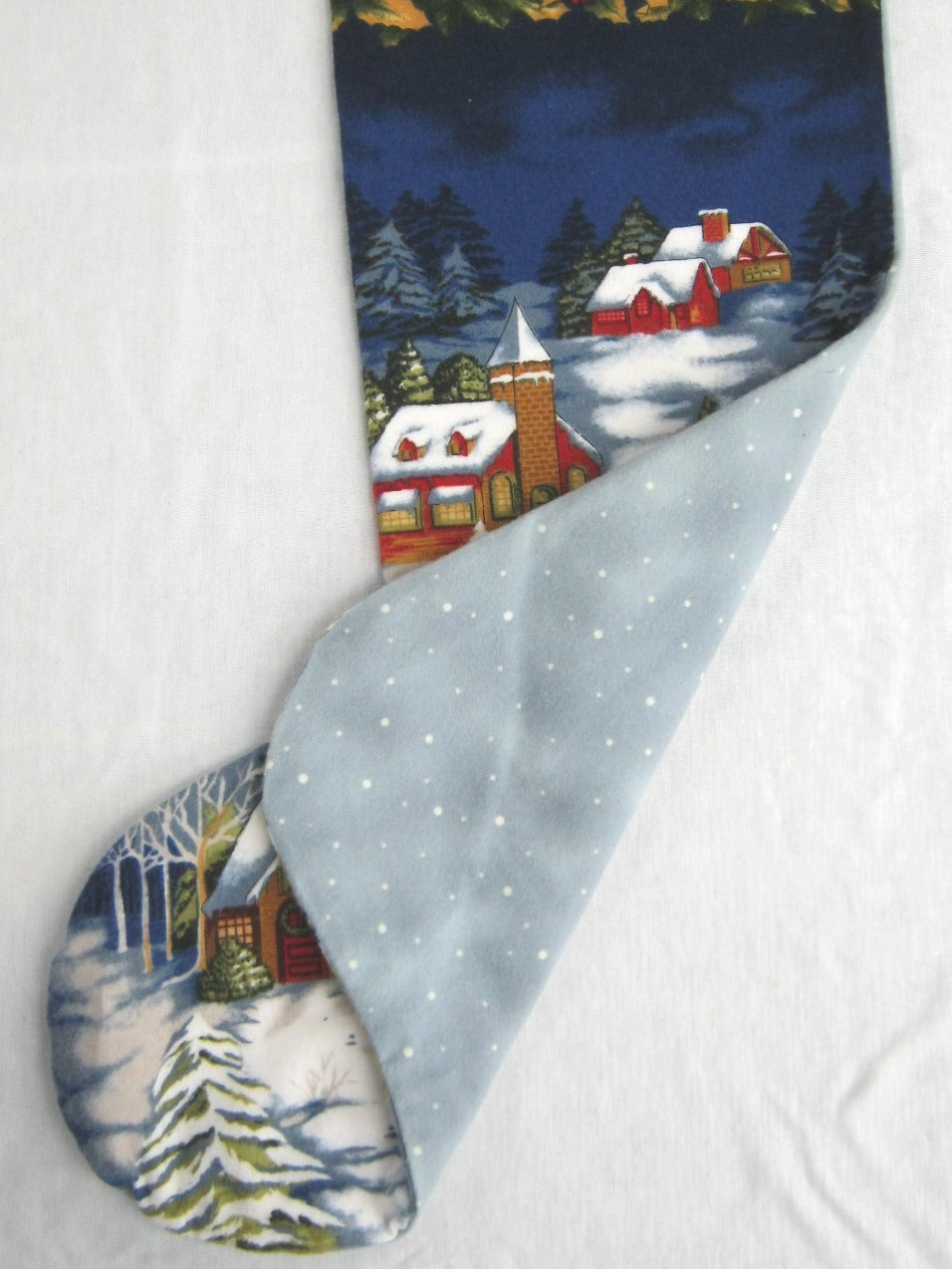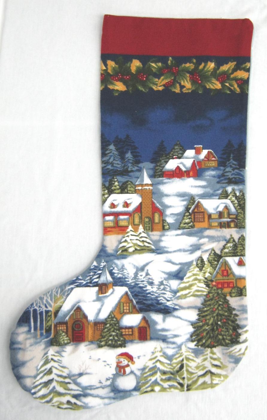 Snowy village scene is on front of stoking, back is a dotted gray resembling falling snow. 20" long, lined with muslin, no handle. 100% cotton flannel.