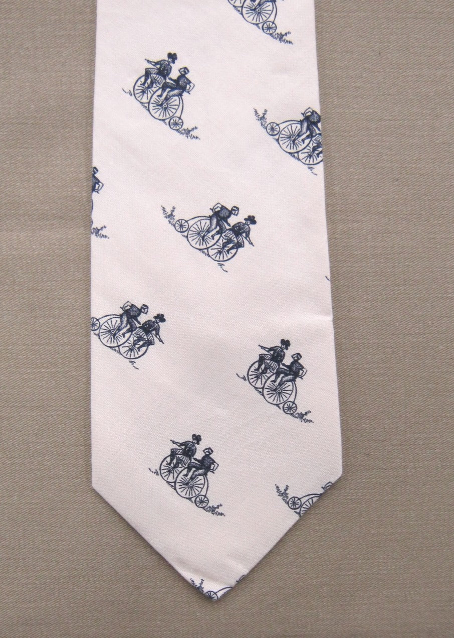 Handmade tie is made from a 100% cotton reproduction print featuring old-fashioned blue bicycles on off-white. Points contain a polyester lining.