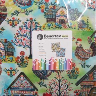 Farm Feathered Folk by Nicole de Camp features folk art style trees, flowers, chickens, farms, dots, and stripes in full bodied yellow, red, blue, green, cream, and brown. 42 squares, 10x10. 100% cotton.